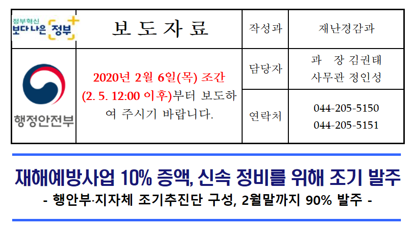 재해예방사업 10% 증액, 신속 정비를 위해 조기 발주