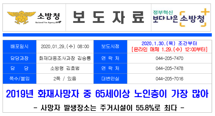 (보도자료) 2019년 화재사망자 중 65세이상 노인층이 가장 많아