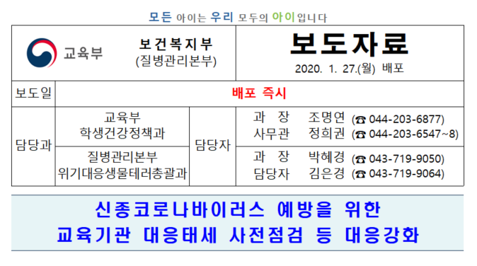 신종코로나바이러스 예방을 위한 교육기관 대응태세 사전점검 등 대응강화
