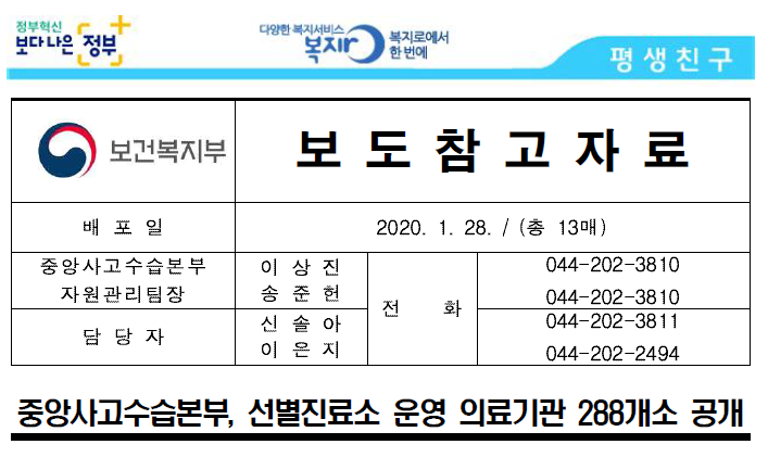 중앙사고수습본부, 선별진료소 운영 의료기관 288개소 공개