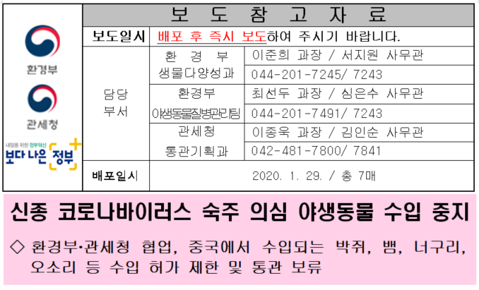 (공동-참고)신종 코로나바이러스 숙주 의심 야생동물 수입 중지