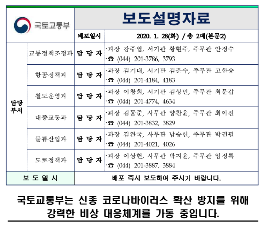 [설명] 국토교통부는 신종 코로나바이러스 확산 방지를 위해 강력한 비상 대응체...