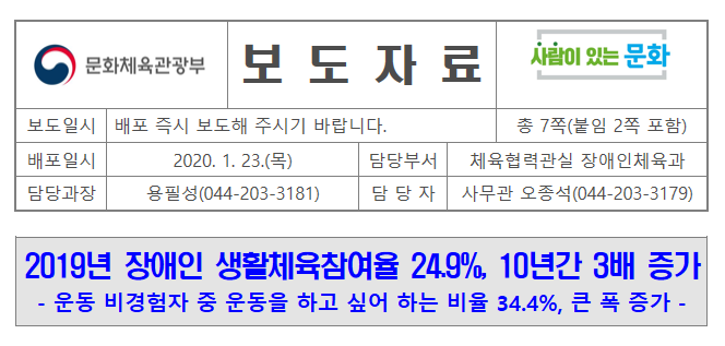 2019년 장애인 생활체육참여율 24.9%, 10년간 3배 증가