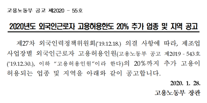 2020년도 외국인근로자 고용허용한도 20% 추가 업종 및 지역 공고