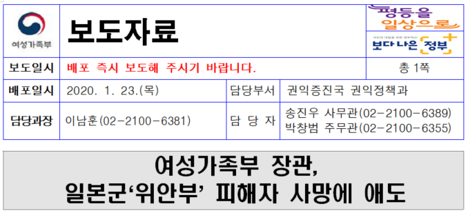 여성가족부 장관, 일본군'위안부' 피해자 사망에 애도