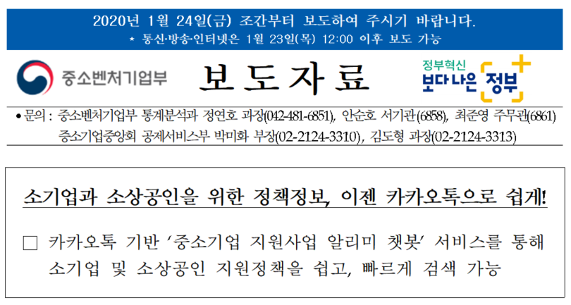 소기업과 소상공인을 위한 정책정보, 이젠 카카오톡으로 쉽게!