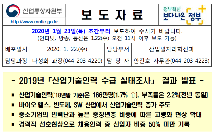 2019년「산업기술인력 수급 실태조사」 결과 발표