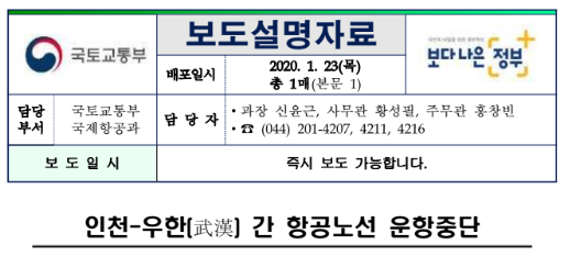 [설명] 인천-우한(武漢) 간 항공노선 운항중단