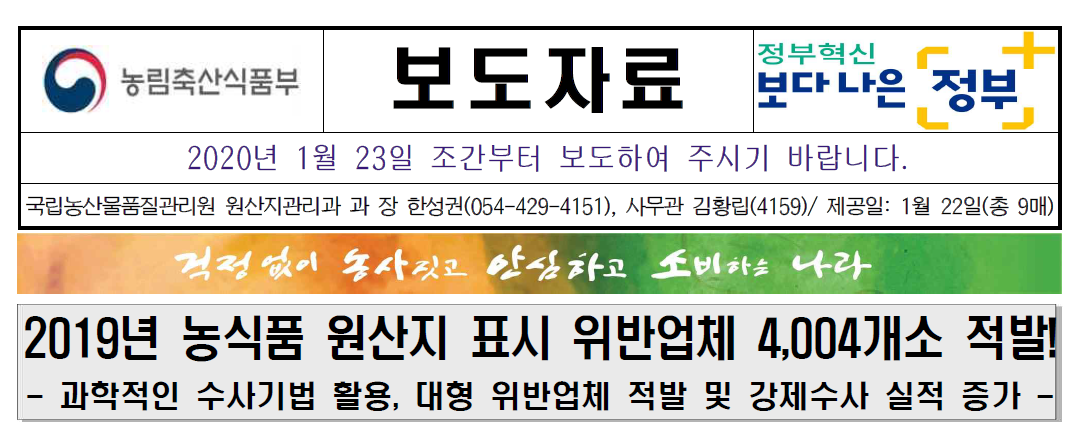 2019년 농식품 원산지 표시 위반업체 4,004개소 적발!