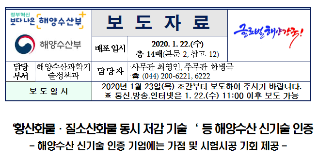 ‘황산화물·질소산화물 동시 저감 기술‘ 등 해양수산 신기술 인증