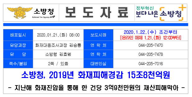 (보도자료) 소방청, 2019년 화재피해경감 15조 8천억원