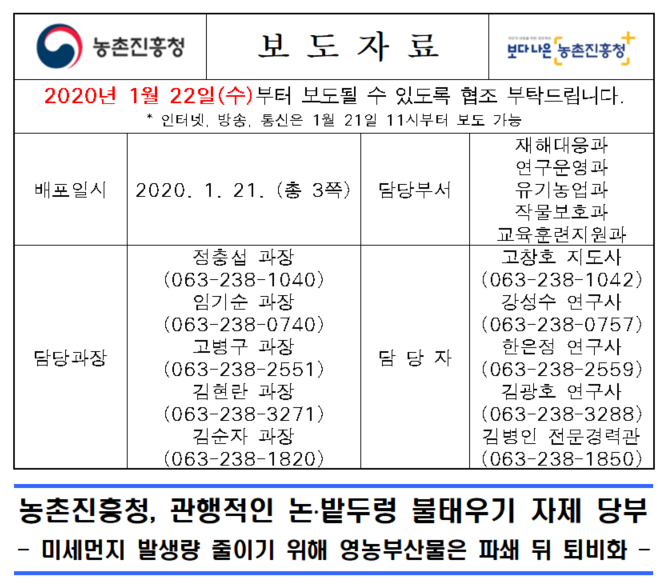 농촌진흥청, 관행적인 논·밭두렁 불태우기 자제 당부