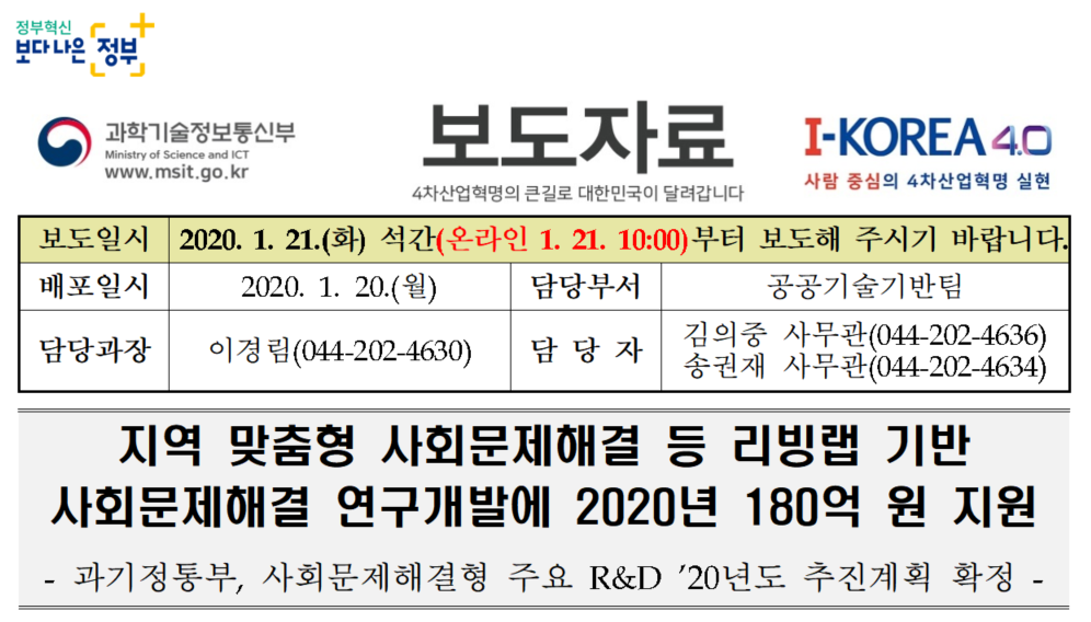 지역 맞춤형 사회문제해결 등 리빙랩 기반 사회문제해결 연구개발에 2020년 1...