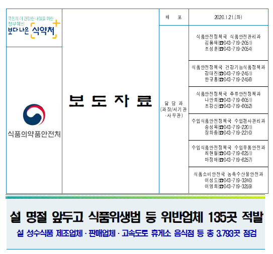 설 명절 앞두고 식품위생법 등 위반업체 135곳 적발