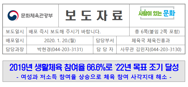 2019년 생활체육 참여율 66.6%로 ’22년 목표 조기 달성