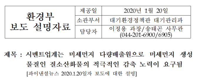 (설명)시멘트업계는 미세먼지 다량배출원으로 미세먼지 생성물질인 질소산화물의 적...