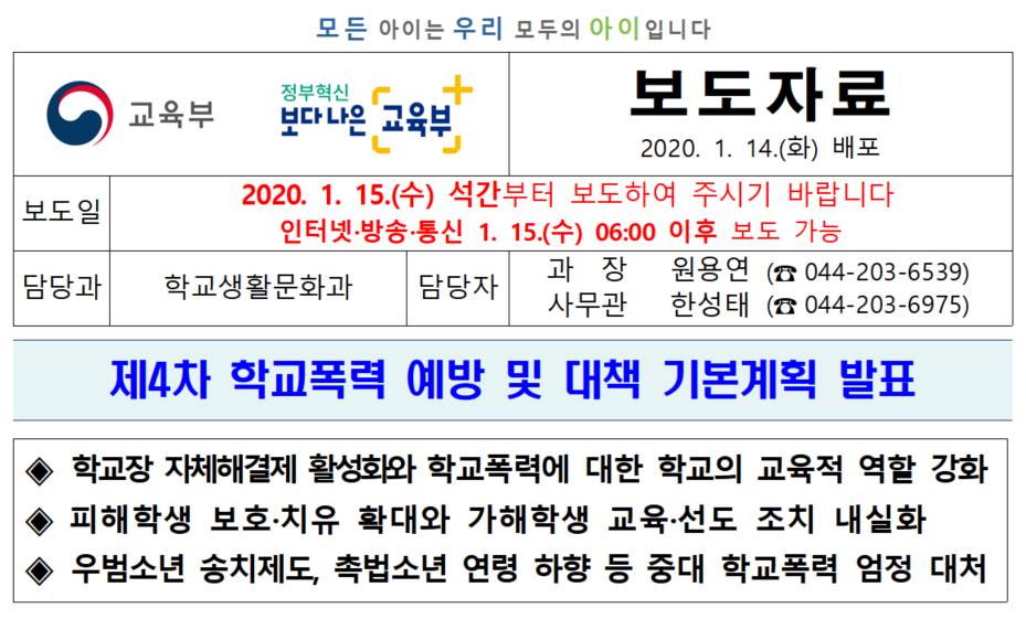 제4차 학교폭력 예방 및 대책 기본계획 발표