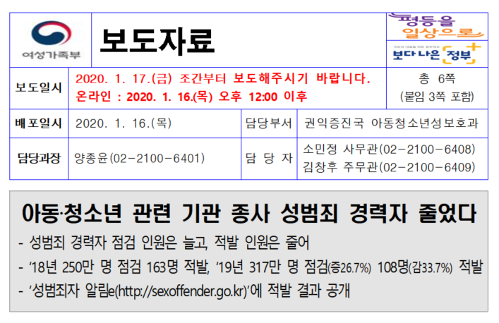 2019년 아동청소년 관련기관의 성범죄 경력자 취업여부 점검결과 발표