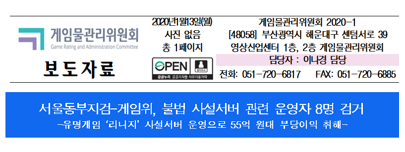 게임위-서울동부지검, 불법 사설서버 관련 운영자 8명 검거