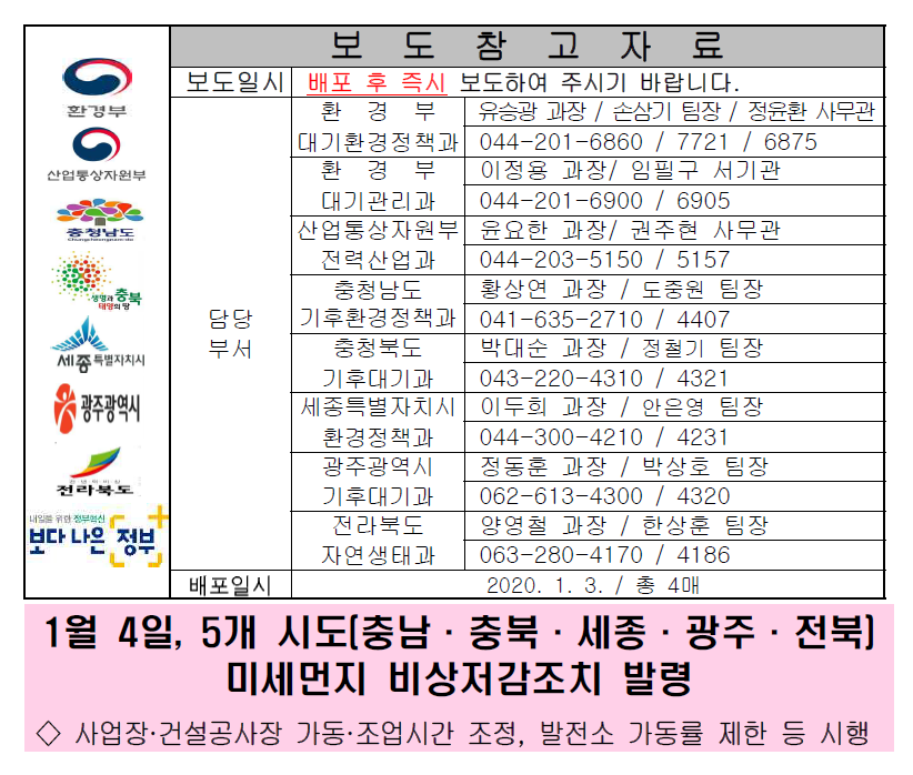 (참고자료)1월 4일, 5개 시도(충남·충북·세종·광주·전북) 미세먼지 비상저...