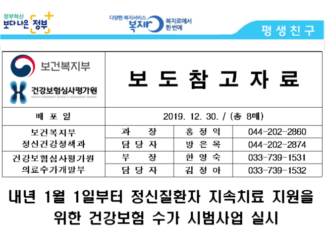 내년 1월 1일부터 정신질환자 지속치료 지원을 위한 건강보험 수가 시범사업 실시