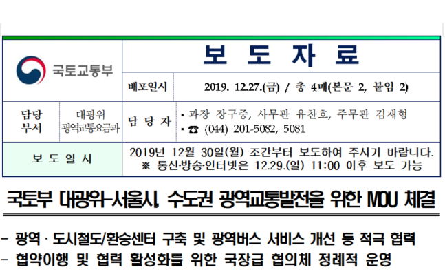 국토부 대광위-서울시, 수도권 광역교통발전을 위한 MOU 체결