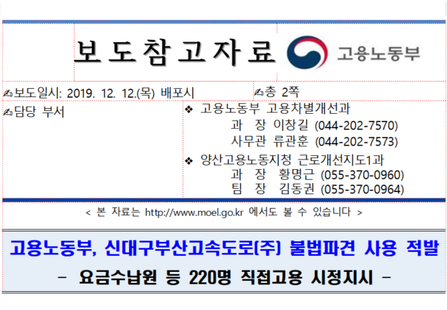 (참고) 고용노동부, 신대구부산고속도로(주) 불법파견 사용 적발