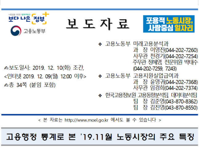 고용행정 통계로 본 ’19.11월 노동시장의 주요 특징