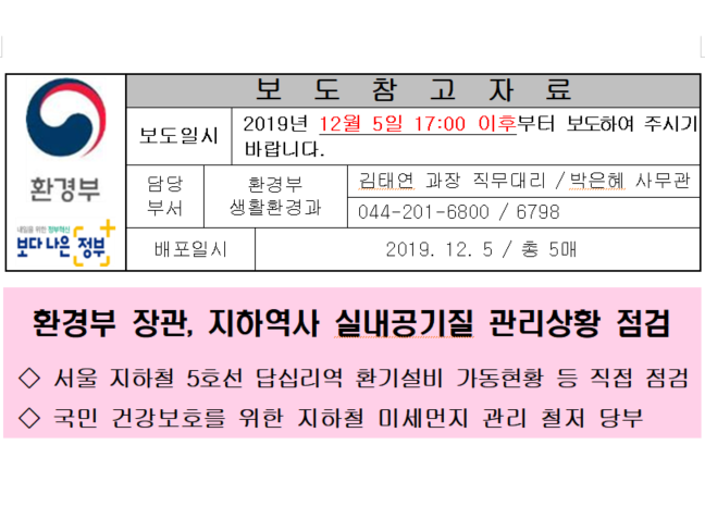 환경부 장관, 지하역사 실내공기질 관리상황 점검