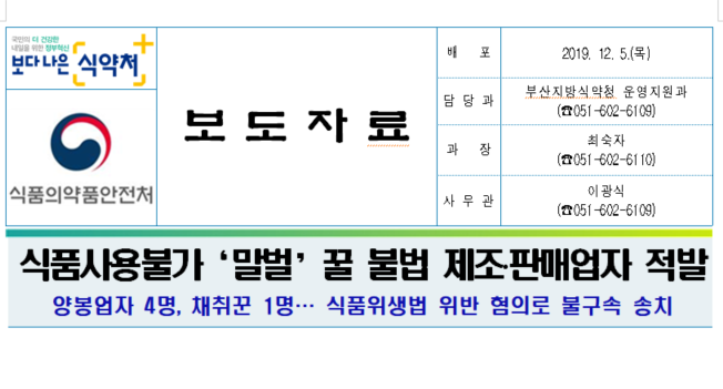 [보도자료]식품사용불가 '말벌' 꿀 불법 제조 · 판매업자 적발