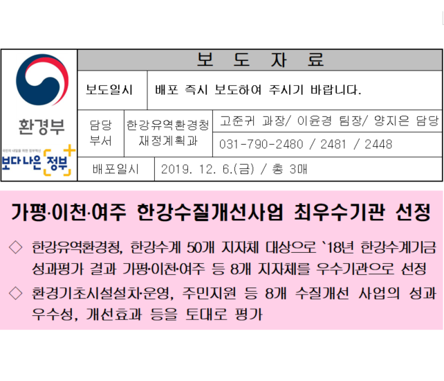 [보도자료] 가평·이천·여주 한강수질개선사업 최우수기관 선정
