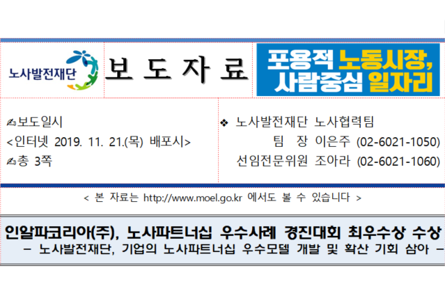 인알파코리아(주), 노사파트너십 우수사례 경진대회 최우수상 수상