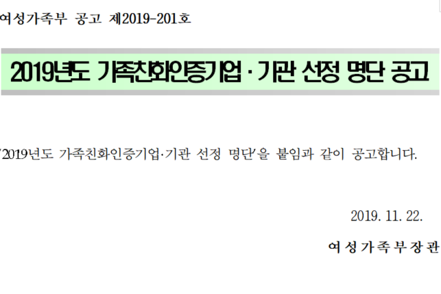 2019년도 가족친화인증기업·기관 선정 명단 공고