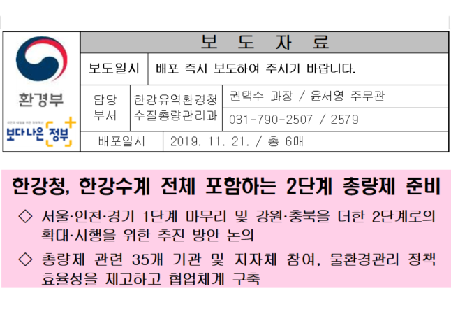 [보도자료] 한강청, 한강수계 전체 포함하는 2단계 수질오염총량제 준비