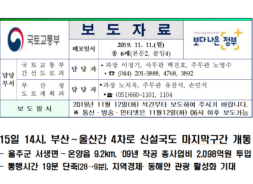 15일 14시, 부산∼울산간 4차로 신설국도 마지막구간 개통