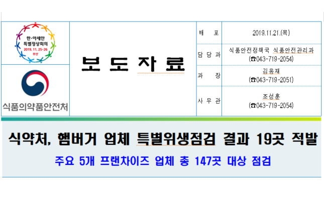 식약처, 햄버거 업체 특별위생점검 결과 19곳 적발
