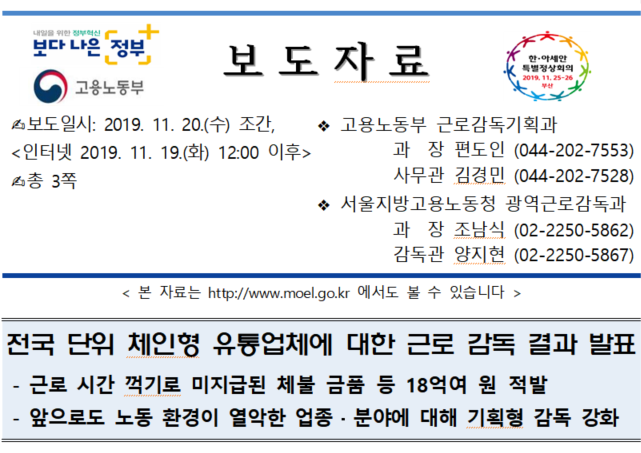 전국 단위 체인형 유통업체에 대한 근로 감독 결과 발표