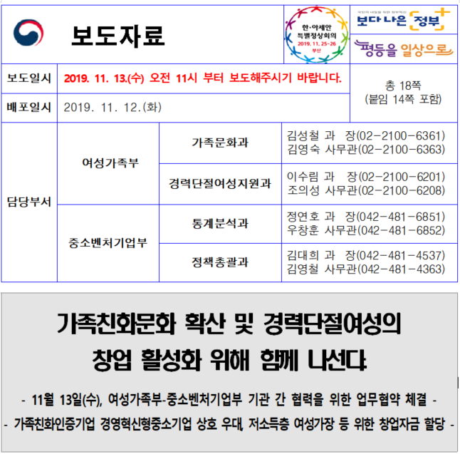 가족친화문화 확산 및 경력단절여성의 창업 활성화 위해 함께 나선다