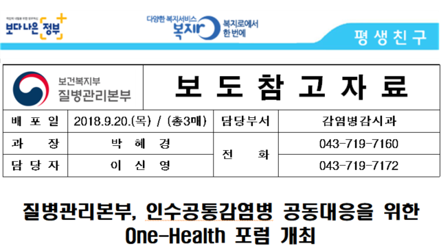 질병관리본부, 인수공통감염병 공동대응을 위한 One-Health 포럼 개최